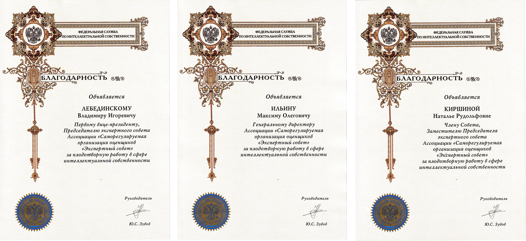04.03.2026 на ежегодном заседании Коллегии Федеральной службы по интеллектуальной собственности руководитель ведомства вручил благодарности представителям Ассоциации «СРОО «Экспертный совет» за плодотворную работу в сфере интеллектуальной собственности и развитие совместных проектов. Награды получили Владимир Лебединский, Максим Ильин и Наталья Киршина.